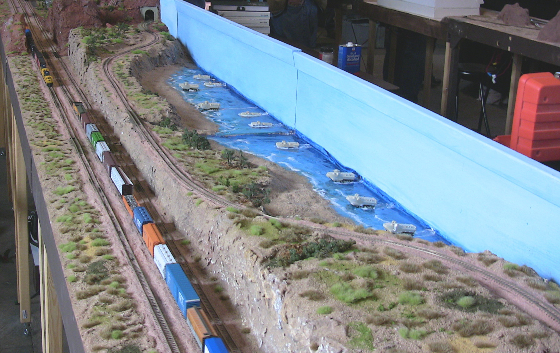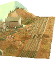 Module Three -- Canyon Scene with truck stop and campground above Indian Ruins. Mountain line installation is in progress. |