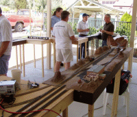 The SNNT club has actively participated in numerous public and private functions, where the display November 2002, setup NTRAK layout in Barstow Harvey House as part of December 2002, setup for Christmas show in the Henderson Convention and Events cente in conjunction with TTOS and NMRA®. December 2003, setup for Christmas show in the Henderson Convention and Events center in conjunction with TTOS and NMRA®. In January 2005 SNNT as a club endorsed transitioning to DCC to control trains during club setups. The club adapted the Digitrax System and purchased equipment. This will be accomplished in steps, first dedicating one mainline to DCC and eventually full DCC control. May 2005, oNeTRAK debut at Joe Dorners. In May 2005 SNNT added oNeTRAK modules to complement the NTRAK modules of the club. This will provide for prototype operations on a single branchline. The oNeTRAK, when setup in a public presentation by SNNT will be solely DCC, with no provisions for DC analog control. Guidelines for club modules have been developed. October 2005, Joint setup with Orange County N'gineers at Barstow Train Show sponsored by NMRA®. July 2006, the club became a 100% NMRA club to take advantage of their insurance umbrella and other benefits. August 2006, radio link added to Digitrax DCC system. Also added requirment for all NTRAK modules to use 12 gauge stranded zip cord on all lines. October 2006 Club purchased a Digitrax DB150 booster to support larger layouts. May 2007. Club adopted material for fire proof skirts for public setups. July 2007, added Mountain line as a requirement for NTRAK modules. Old modules will use a rear bypass. December 2007, Setup NTRAK at Boulder City Holiday Train Show. June 2008 Club authorized the purchase of a trailer to transport and store club modules. December 2008, Boulder City Santa Train NTRAK setup. April 2009, Winslow Arizona Railroad days NTRAK setup with multiple clubs from Arizona. October 2009, Barstow Train Show NTRAK setup in the Harvey House. December 2009, Boulder City Santa Train NTRAK setup. April 2010, Winslow Arizona Railroad Days NTRAK setup. October 2010, Barstow Train Show setup as part of NMRA® event. October 2010, Debut of T-TRAK at Green Valley Library Arts and Crafts show. December 2010, Holiday Craft & Gift Festival at South Point Hotel and Casino NTRAK setup December 2010, Sun City Sumerlin NTRAK setup. January 2011, the club adopted T-TRAK modules as an alternate for those members who wish to build them with no club modules for funding. April 2011, SNNT participated in the 2011 Winslow Arizona Railroad Days NTRAK layout with the Tucson club and membes of the Denver Colorado club. |